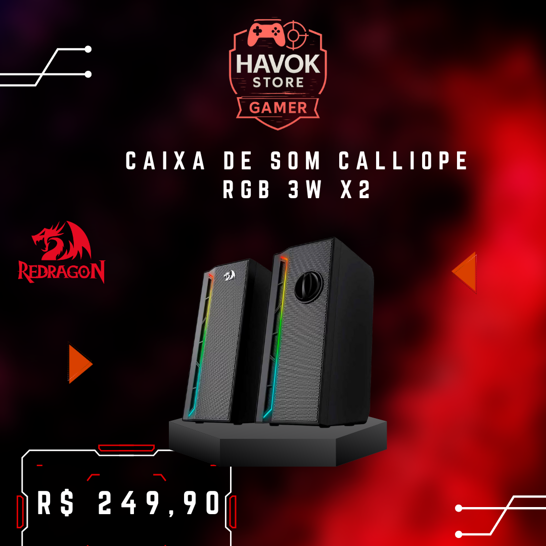 Transforme seu setup com a Redragon GS580 Calliope RGB: dual drivers de 3 W cada, iluminação RGB dinâmica, conexão USB + 3,5 mm e controle de volume integrado, som envolvente e estilo imediato para games, filmes e música hoje mesmo.