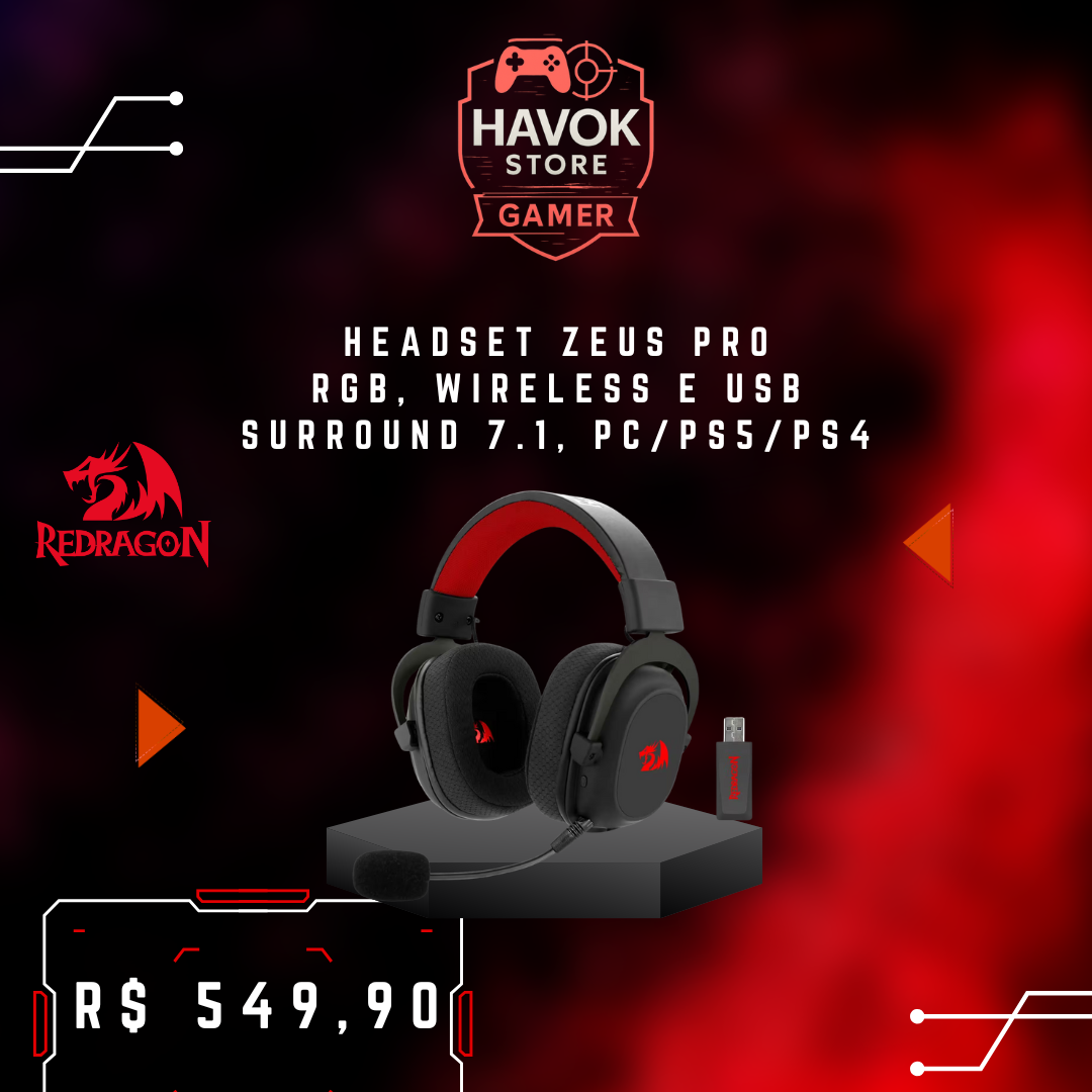 Mergulhe no som com o Zeus Pro RGB: drivers de 53 mm com áudio 7.1 virtual, conexão tri-modo (2,4 GHz wireless, Bluetooth e cabo USB), microfone removível com cancelamento de ruído e iluminação RGB personalizável, desempenho envolvente para jogar, conversar e curtir hoje.
