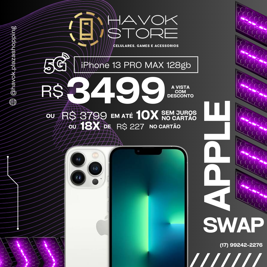 O iPhone 13 Pro Max combina tela Super Retina XDR de 6,7″ com taxa de atualização até 120 Hz, chip A15 Bionic topo de linha, sistema de três câmeras profissionais, corpo resistente com certificação IP68, pronto para acompanhar seu dia com desempenho, estilo e longevidade.