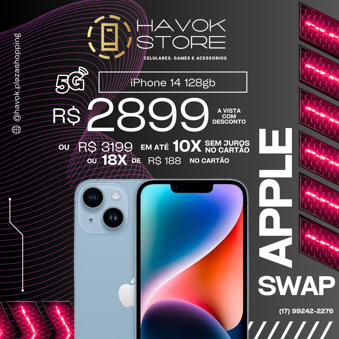Apple iPhone 14: Tela Super Retina XDR de 6,1″, chip A15 Bionic, sistema de câmera dupla de 12 MP, conectividade 5G, detecção de colisão e SOS via satélite, desempenho confiável e moderno para o seu dia.