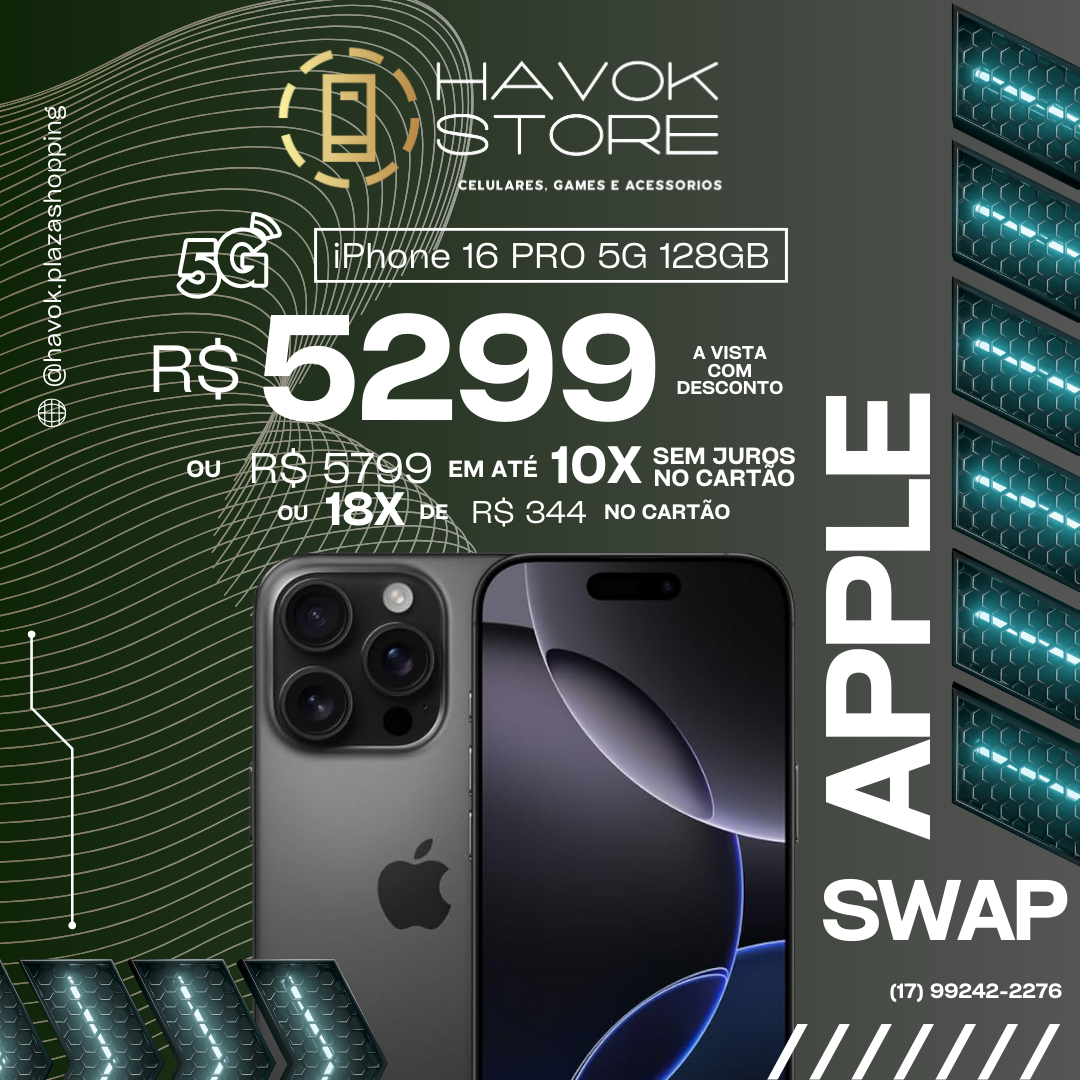 O iPhone 16 Pro traz tela Super Retina XDR de 6,3″ com ProMotion até 120 Hz, chip A18 Pro de altíssima performance, câmera tripla com telefoto 5× e gravação em 4K 120 fps, corpo em titânio leve e resistente, suporte a Wi-Fi 7 e USB-C de alta velocidade, pronto para redefinir seu dia hoje.