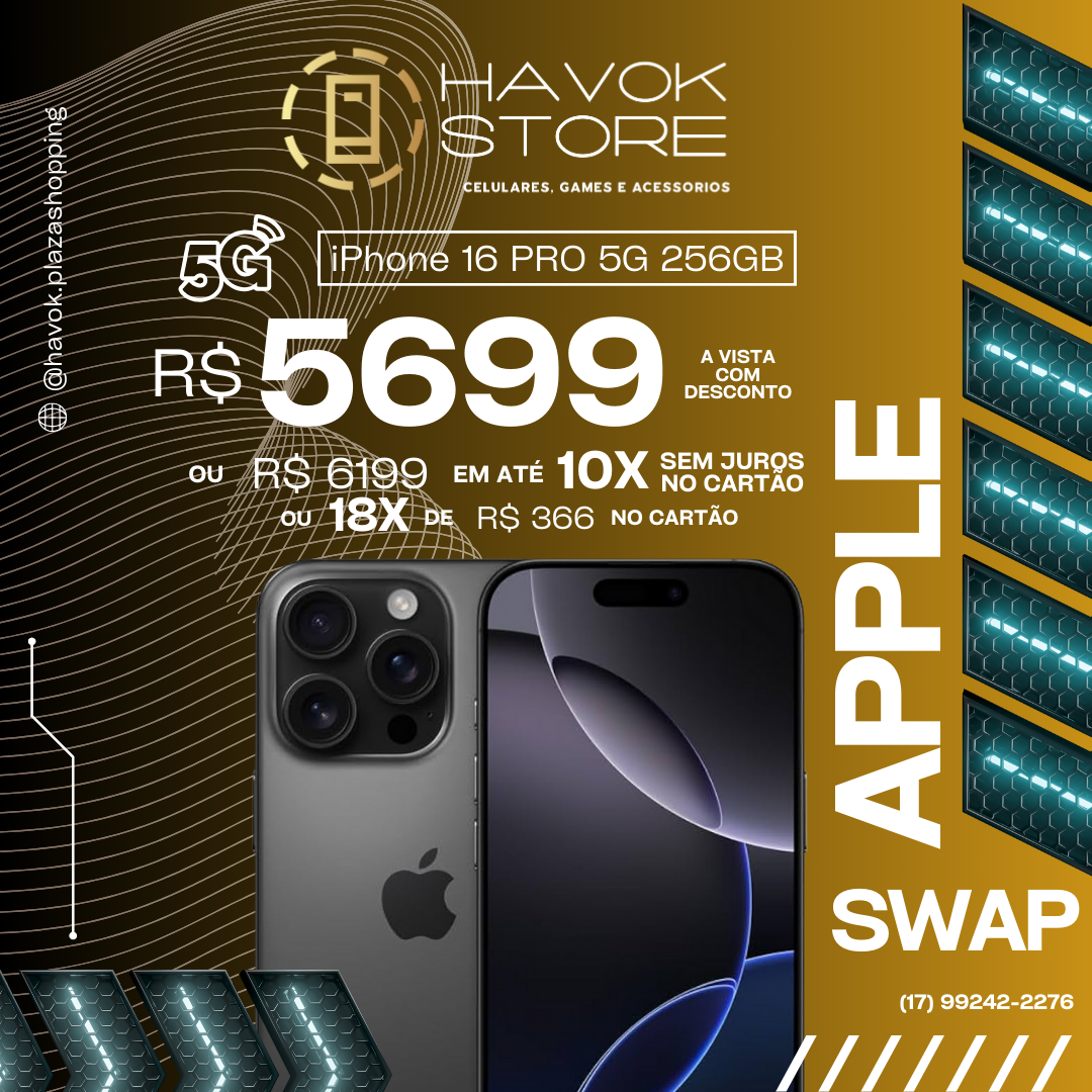 O iPhone 16 Pro traz tela Super Retina XDR de 6,3″ com ProMotion até 120 Hz, chip A18 Pro de altíssima performance, câmera tripla com telefoto 5× e gravação em 4K 120 fps, corpo em titânio leve e resistente, suporte a Wi-Fi 7 e USB-C de alta velocidade, pronto para redefinir seu dia hoje.