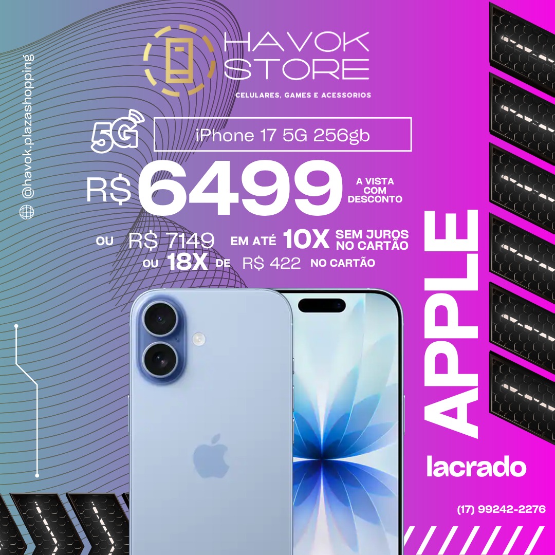 O iPhone 17 apresenta tela OLED Super Retina XDR de 6,3″ com ProMotion 120 Hz e Always-On, chip A19, sistema de câmeras 48 MP + 48 MP, design em alumínio com Ceramic Shield 2, IP68, e armazenamento de 256 GB/512 GB, desempenho e inovação no seu dia.