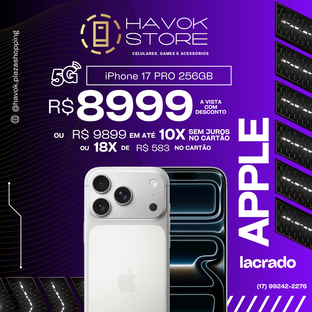 O iPhone 17 Pro traz tela Super Retina XDR de 6,3″ com ProMotion até 120 Hz, chip A19 Pro, três câmeras de 48 MP com zoom óptico de até 8×, corpo em alumínio unibody e resistência IP68, potência máxima, estilo marcante e inovação para seu dia.