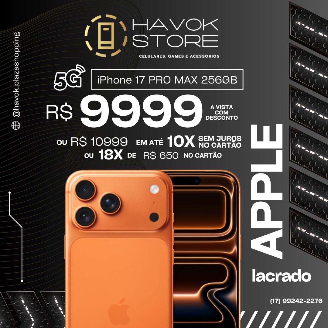 O Apple iPhone 17 Pro Max reúne tela Super Retina XDR OLED de 6,9″ com ProMotion de até 120 Hz, chip A19 Pro ultra-potente, sistema de câmeras triplo de 48 MP com zoom óptico até 8×, corpo em alumínio unibody e carga rápida USB-C, o ápice da tecnologia no seu bolso.