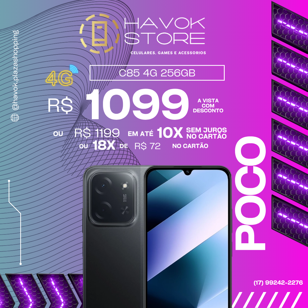 O POCO C85 4G com 256 GB entrega tela de 6,9″ com taxa de atualização de 120 Hz, processador MediaTek Helio G81‑Ultra, câmera traseira de 50 MP, bateria de 6.000 mAh com recarga rápida de 33 W, fluidez, espaço e autonomia para o seu dia, já.