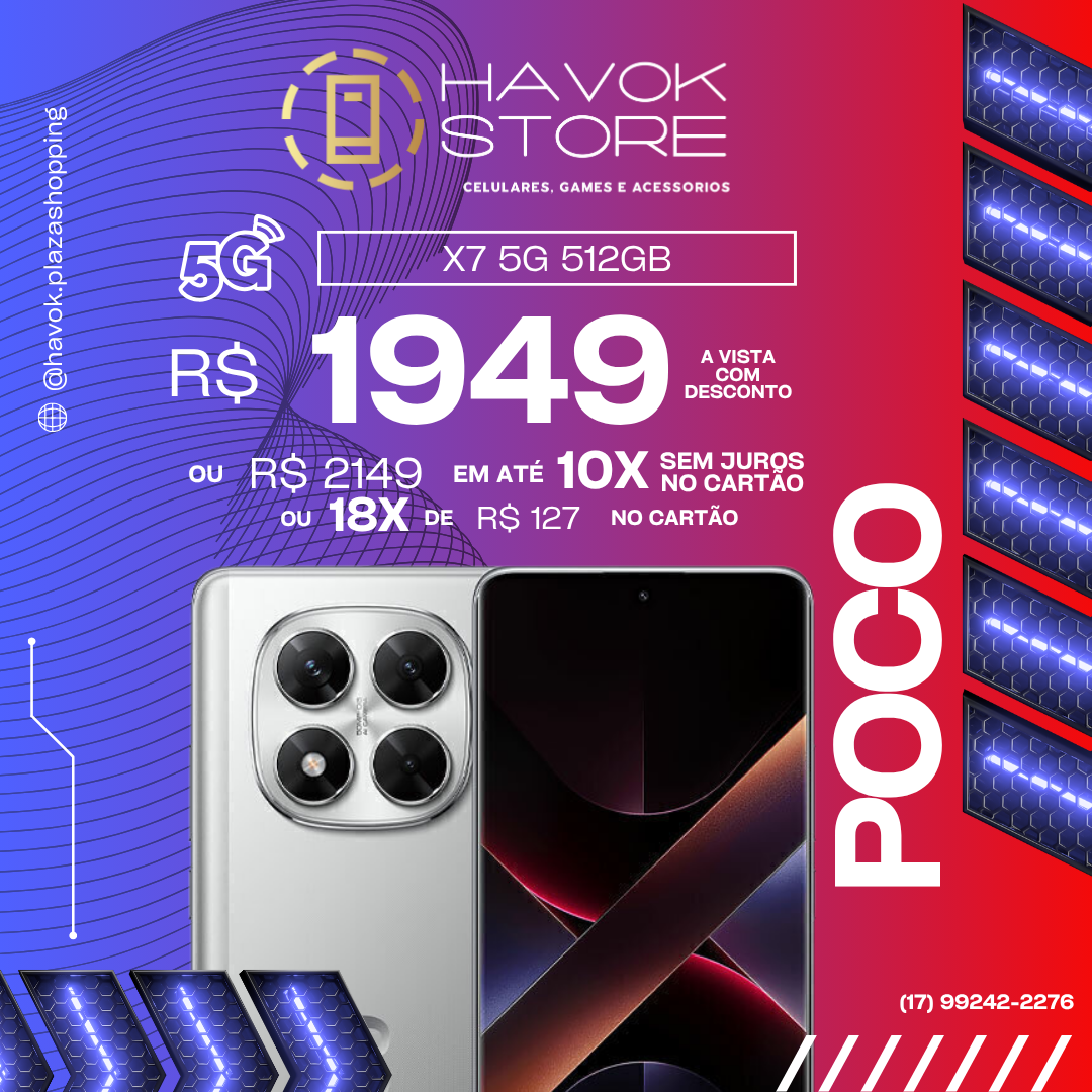 O POCO X7 5G (256 GB) traz tela curva AMOLED de 6,67″ com 120 Hz, chip Dimensity 7300-Ultra em 4 nm, câmera de 50 MP com OIS, bateria de 5.110 mAh e proteção IP68, desempenho premium e fluidez completa para seu dia a dia agora.